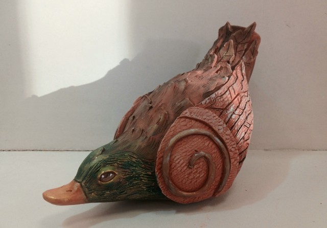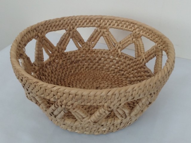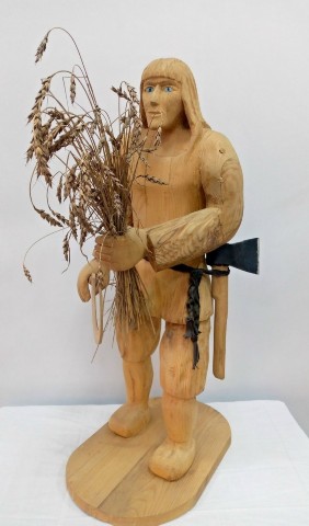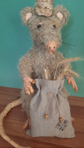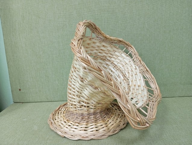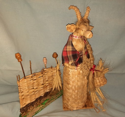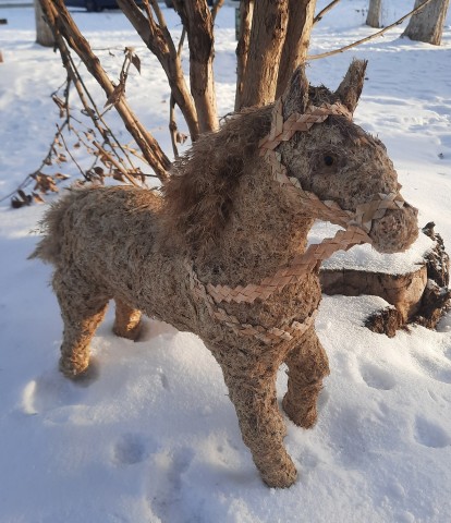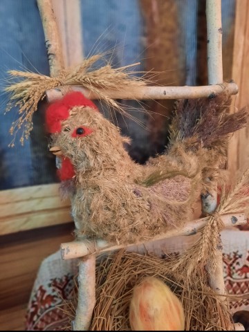 Выполнен полностью из сена ,без каркаса (цельная) , декор рогоз и камыш